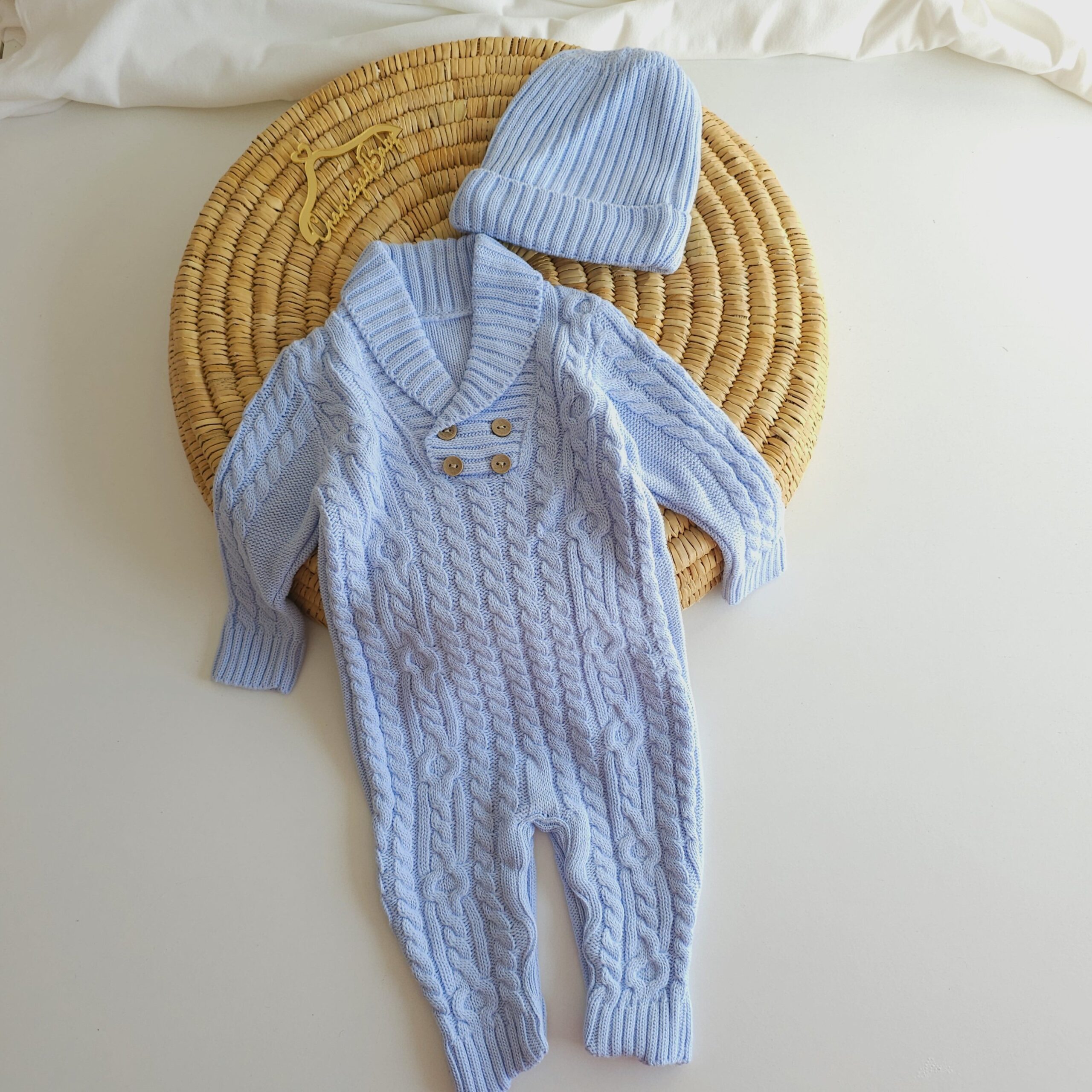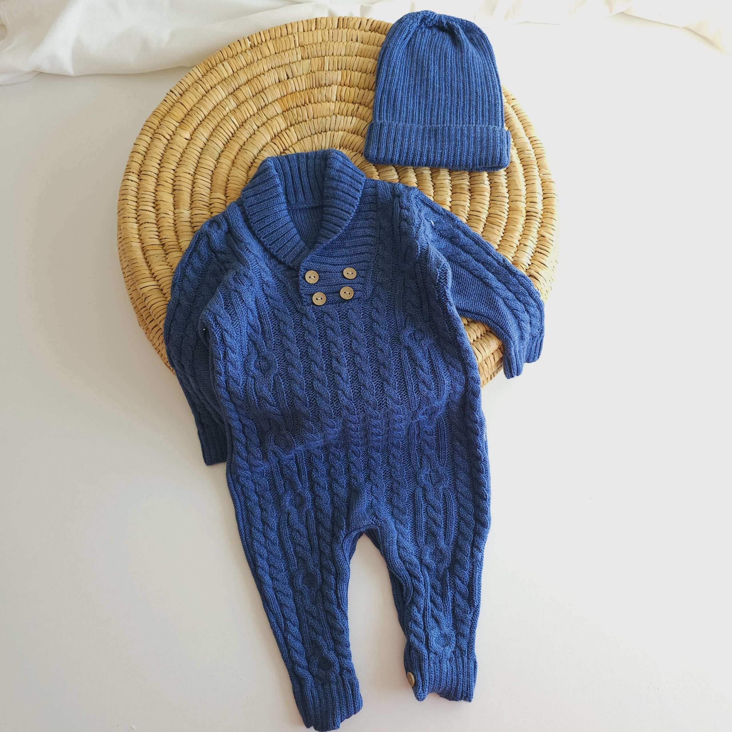 Adorable ensemble en tricot composé d’une combinaison torsadée et d’un bonnet assorti, disponible en bleu ciel, gris perle et bleu marine.