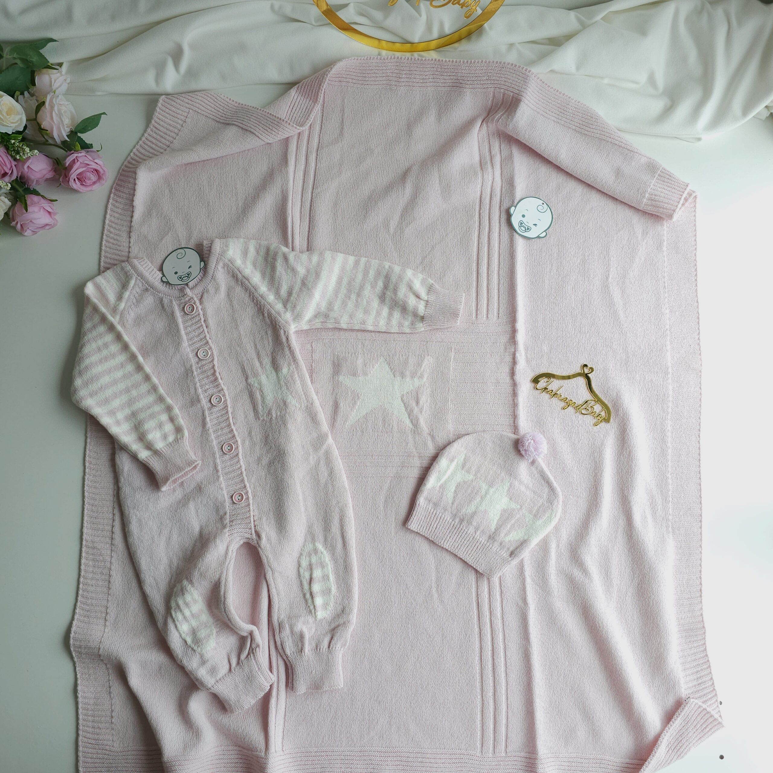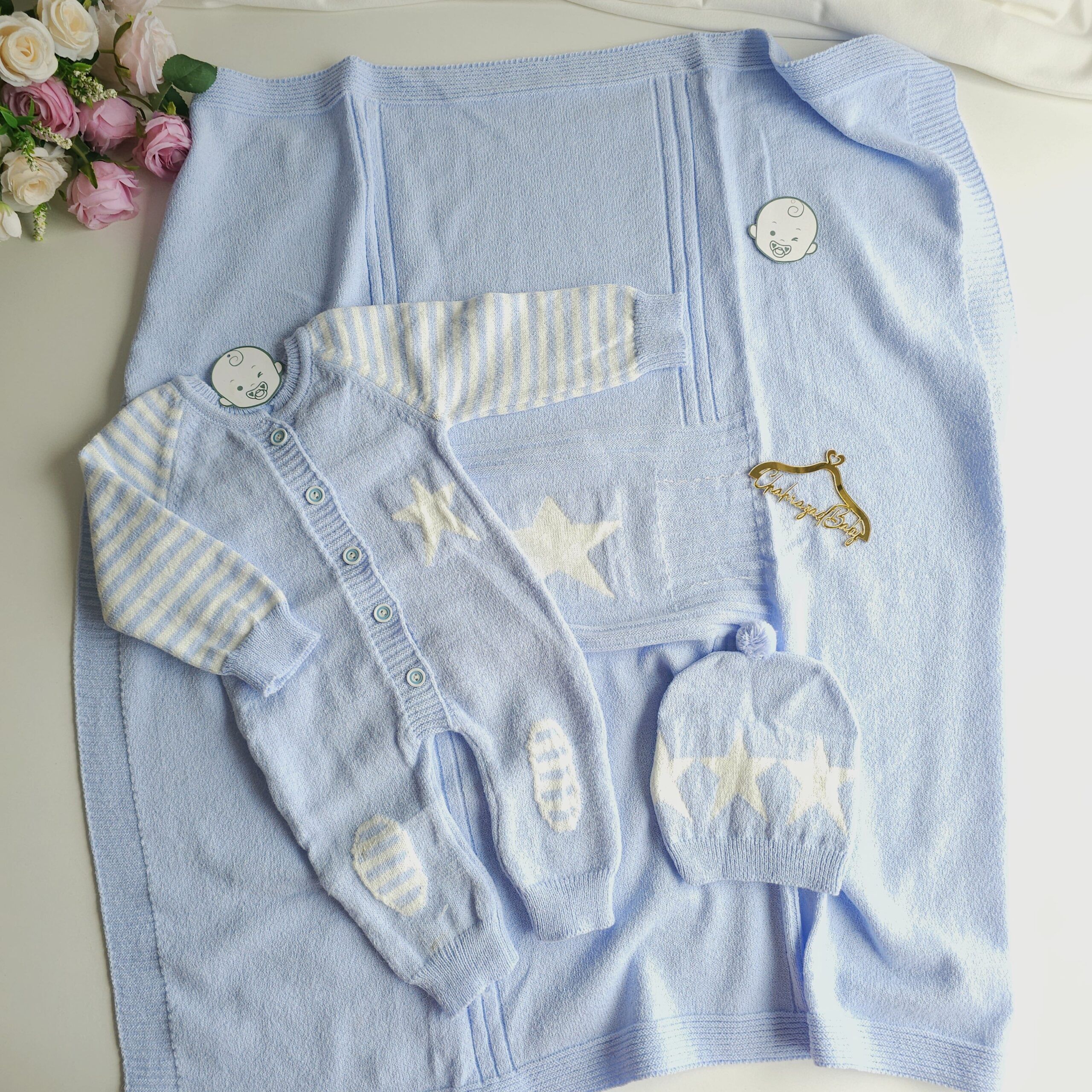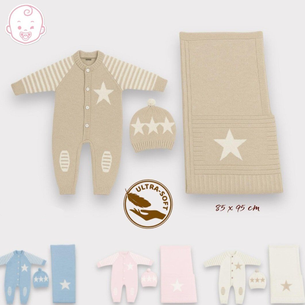 Offrez à votre bébé un confort absolu avec cet ensemble tricoté ultra-doux composé d’une grenouillère chaude, d’un bonnet assorti et d’une couverture moelleuse. Conçu en maille respirante et délicate, il maintient votre petit bien au chaud tout en restant léger sur la peau. Les motifs étoiles et les rayures ajoutent une touche élégante et intemporelle, idéale pour les sorties, les photos ou les cadeaux de naissance. Un essentiel cosy et chic pour les premiers mois de votre bébé.