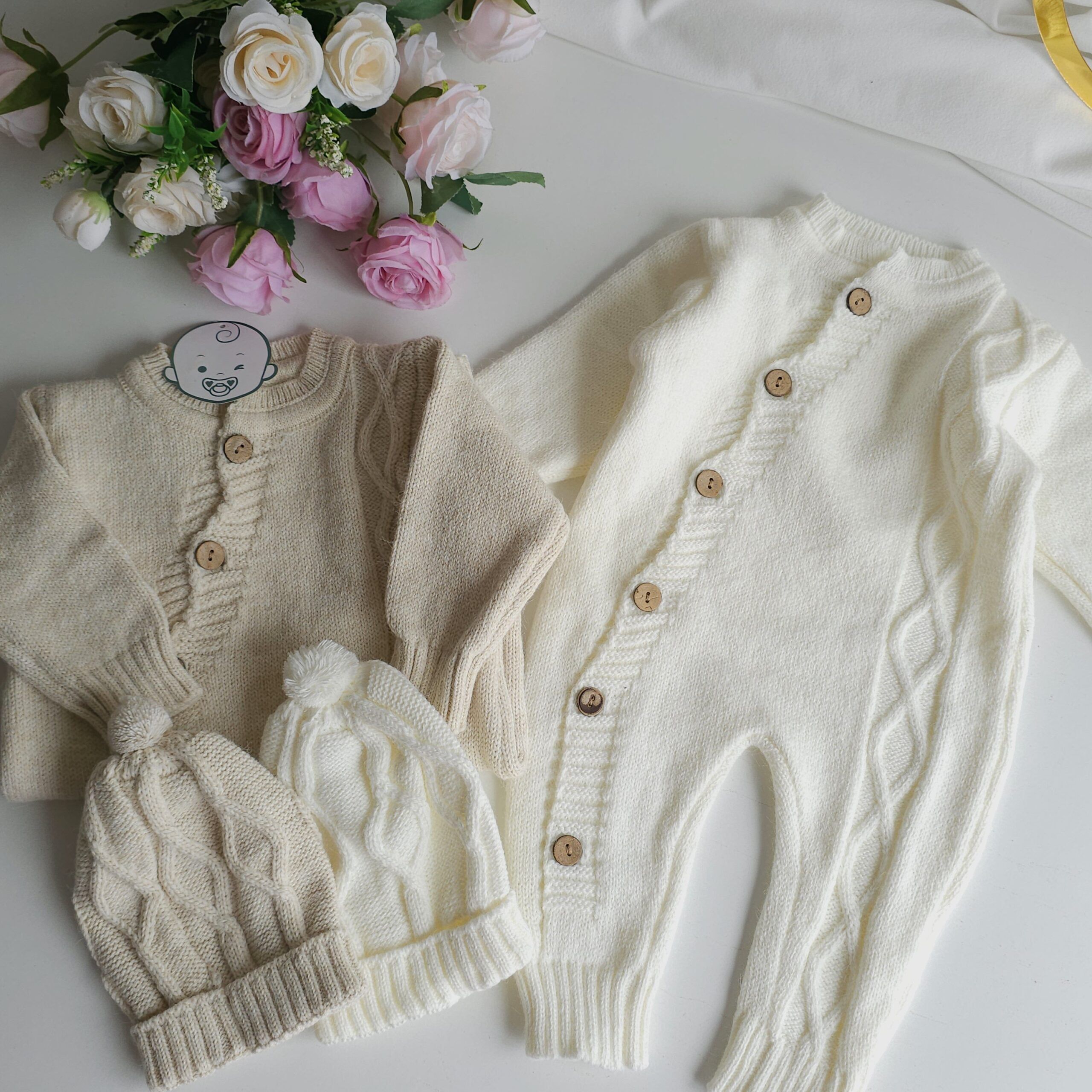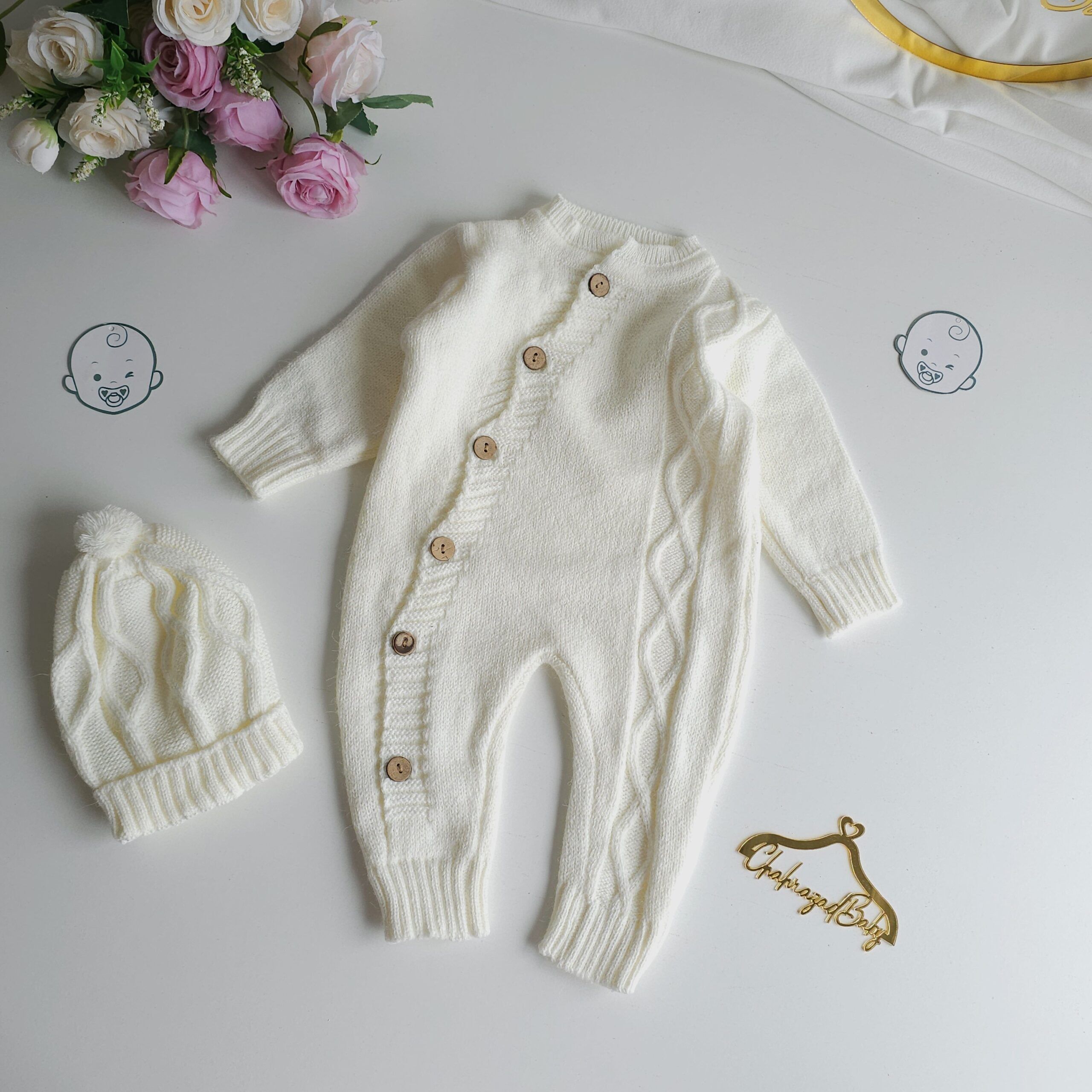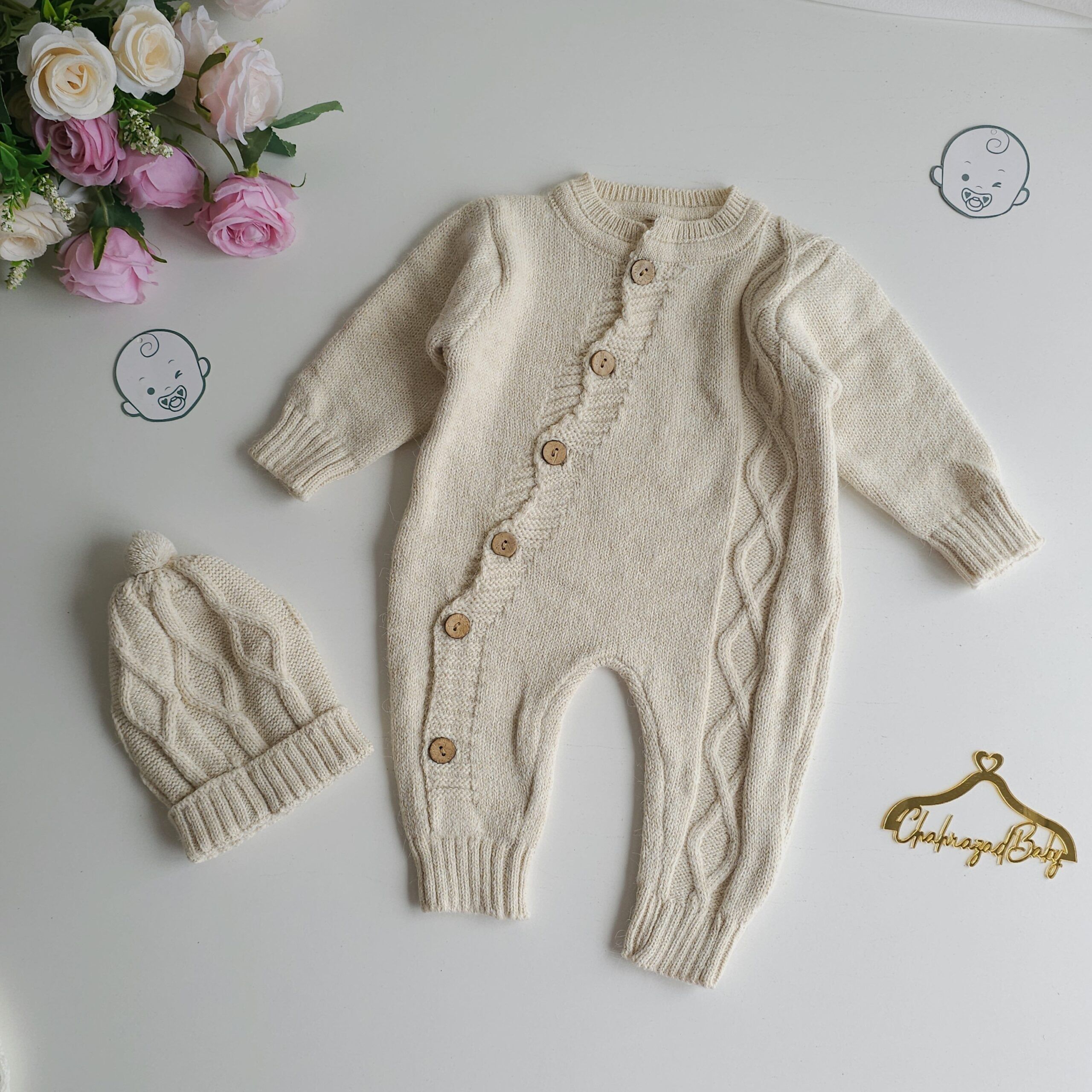 Craquez pour cet ensemble bébé en maille tricotée, à la fois doux, chic et confortable. Confectionné avec soin, il se compose d’une pièce tricotée boutonnée avec de jolis boutons en bois, accompagnée d’un bonnet assorti.