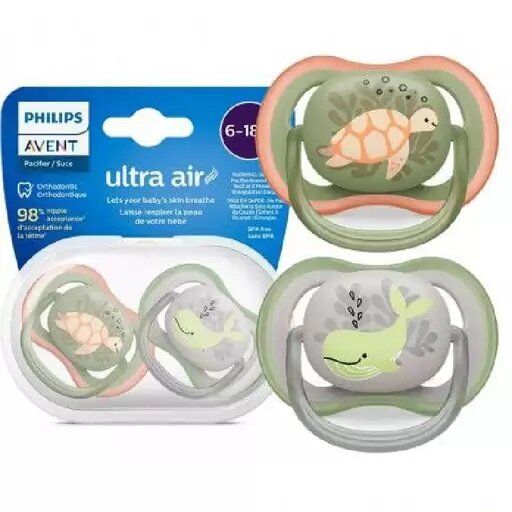 Réconfortez votre bébé avec le confort de la circulation d’air. La sucette ultra air Philips Avent est dotée de trous extra-larges qui maintiennent la peau au sec. Elle est également dotée d’une pastille phosphorescente permettant de la repérer une fois la lumière éteinte. Différents coloris et décorations sont disponibles.
